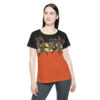 Young woman wearing all over print of chinese horse shirt 2 with sunlight behind her.