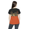 Woman wearing a fashionable tshirt featuring an ad of antique toys in a victorian style